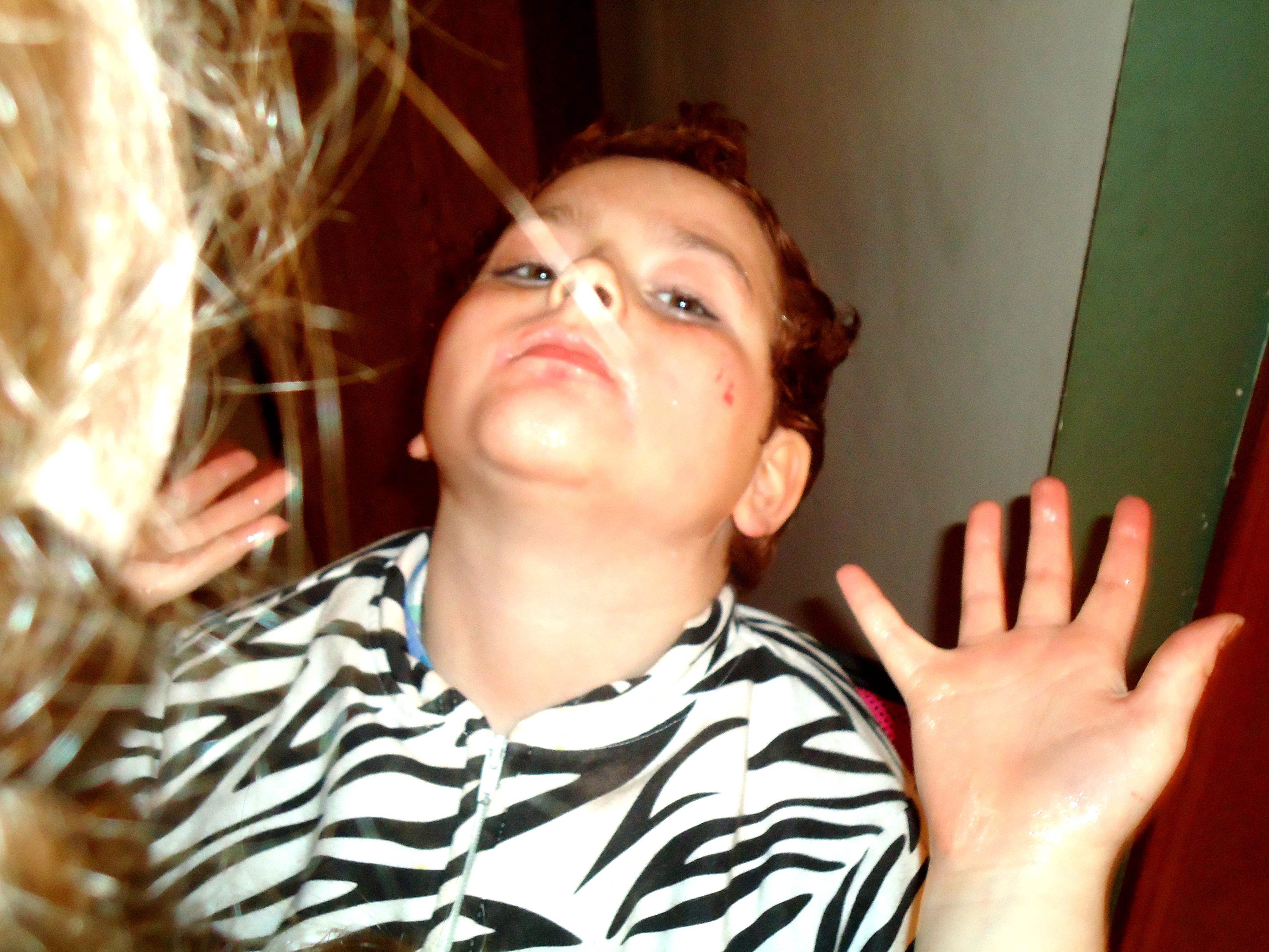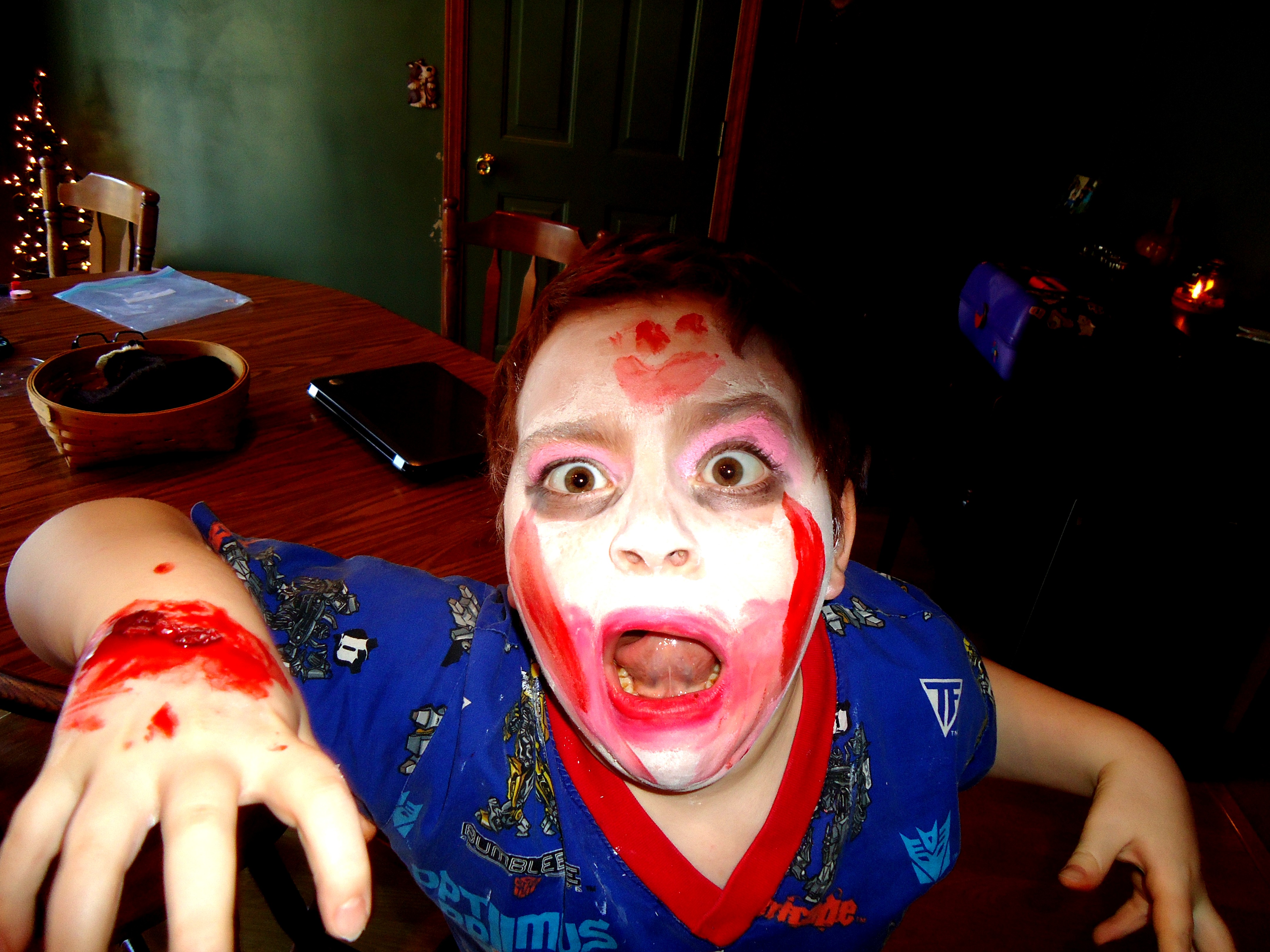 DSC04318School was cancelled again today and they’ve already called it for tomorrow. It’s supposed to get down to -15 degrees tonight, and that’s not even with the wind chill factor. I stayed home as well. I probably could’ve made it into work, but what was the point? No trucks were running today so we didn’t get any deliveries. I would’ve been sitting at my desk trolling the internet for albums I shouldn’t buy and guitars I can’t afford. Such is the life of the music obsessive. So on this day off I head downstairs and begin transferring songs from my 4-track cassette recorder to my digital mixer so I can master these songs and ready them for a 4-song e.p. under the sunnydaymassacre moniker. This is the part I love about the music process. The mixing, tweaking, panning, mastering, sequencing…all the little things that add up to one big thing. After spending an hour or so downstairs I came up to find my daughter applying make-up to my son’s face. Not pretty make-up, but dead, zombie make-up. He looked like a ghoulish mess; dark rings under his eyes, Geisha-white face cream, and gory, gory blood splatter. I’m a huge fan of horror and gore, and those kids made their dad proud.