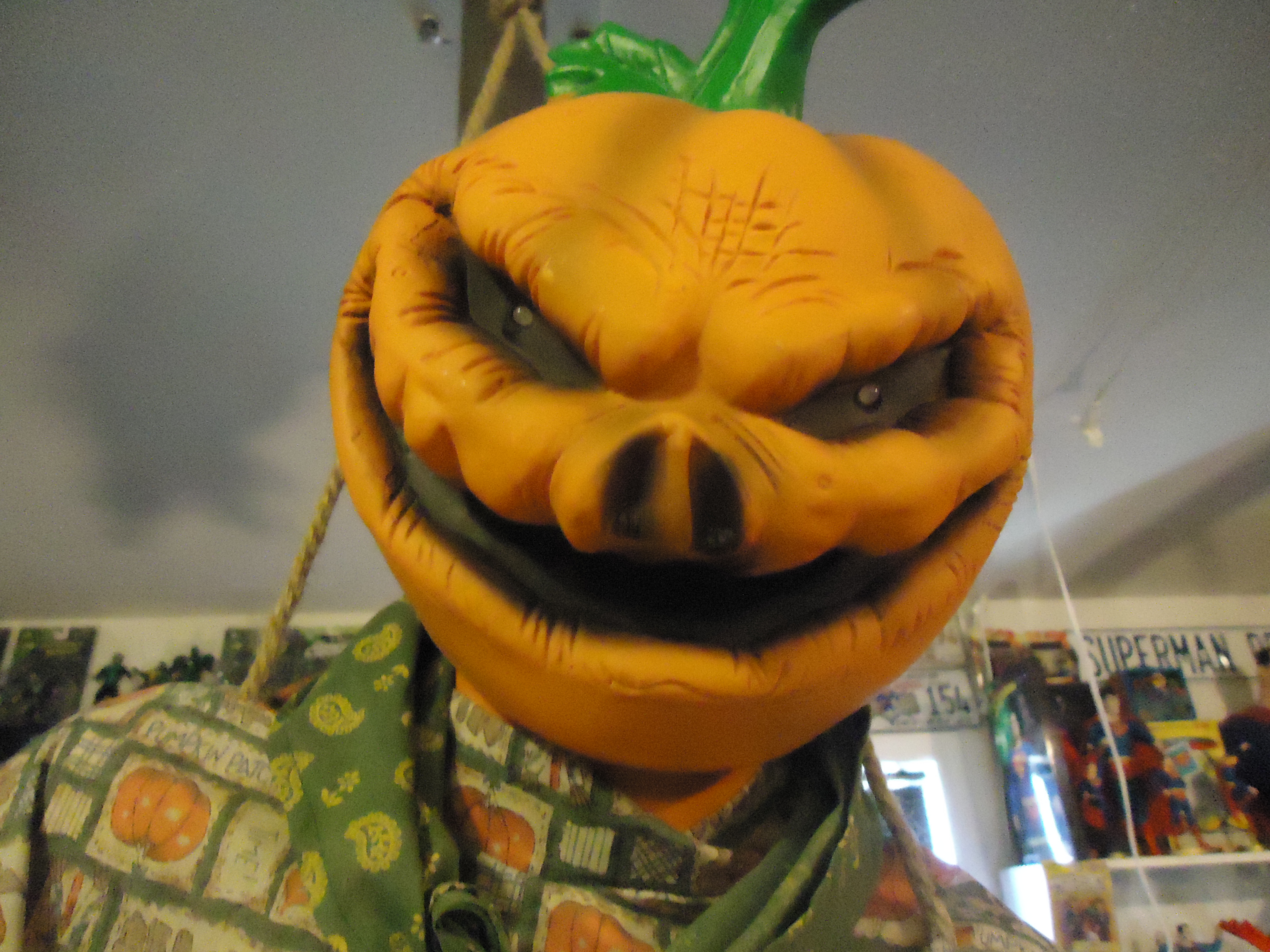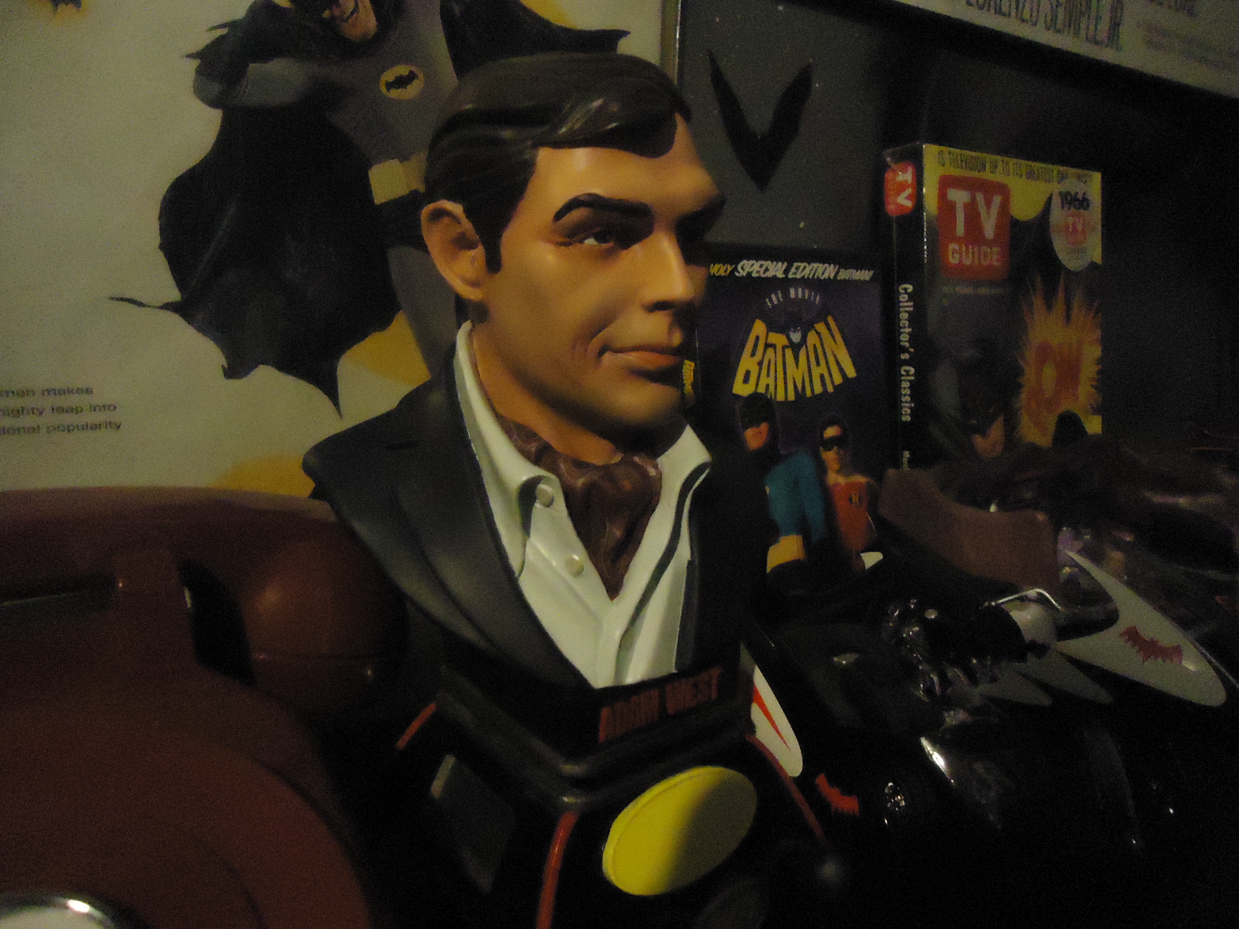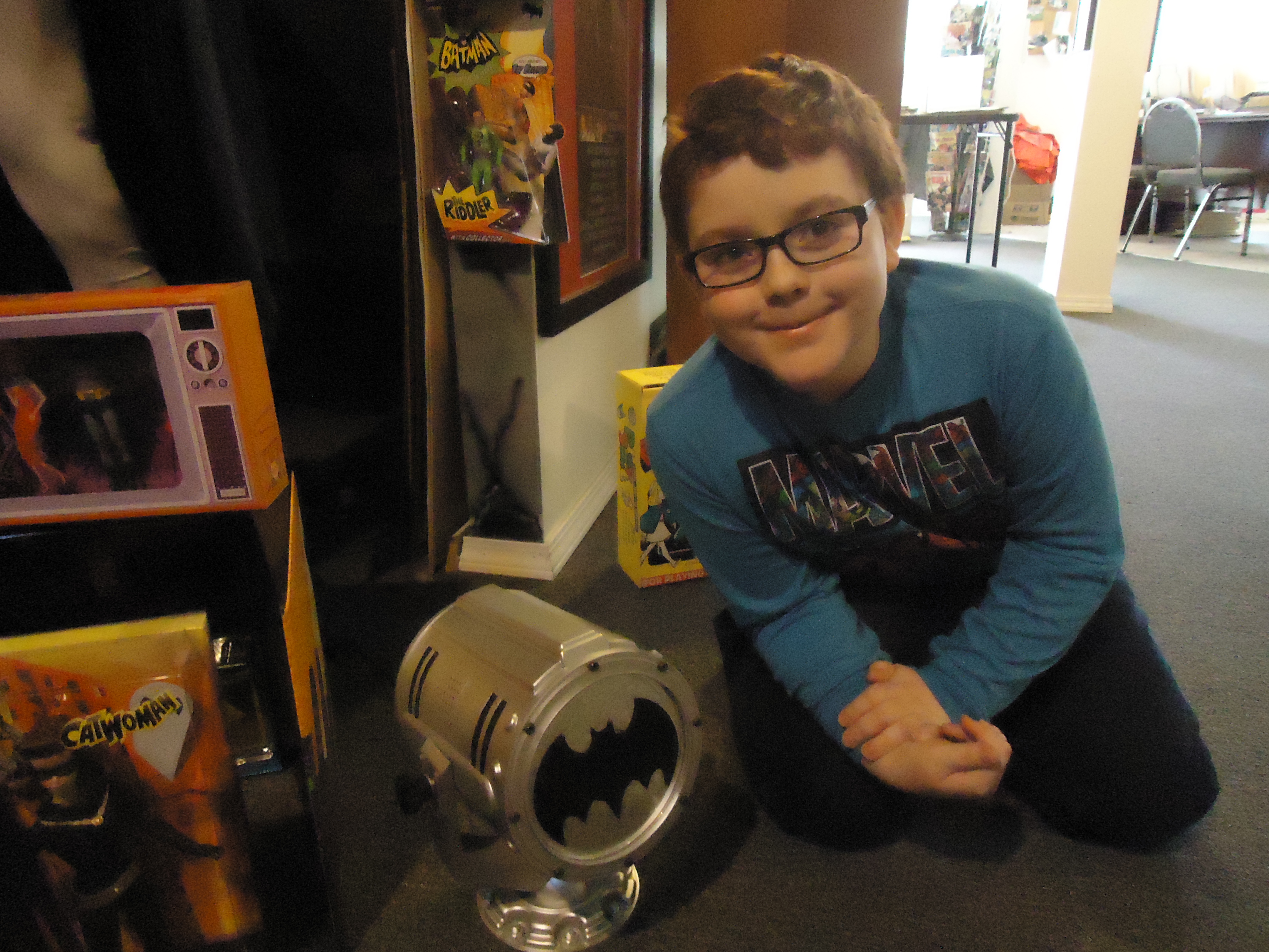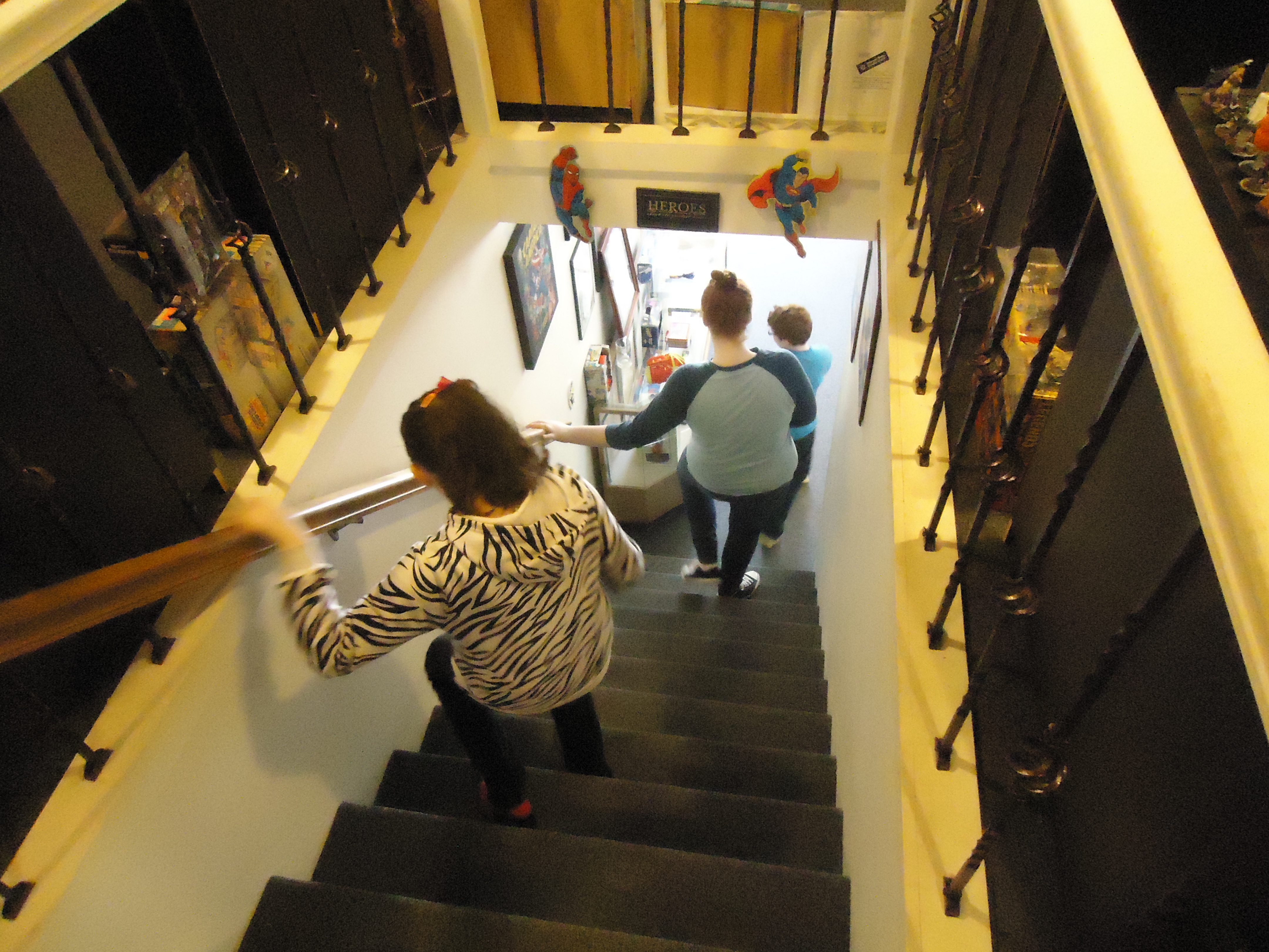 which looks like a pull-barn that was converted to look like the home of Superman, Batman, Wonder Woman, and the The Wonder Twins. You walk inside and the place is nice and cool(I’m sure it’s climate controlled due to all the collectibles, including comics.) There’s a teenage boy playing video games at the front desk and he takes our money. $20 for four of us($6 for adults and $4 for kids 10 and under), which I didn’t think was bad. It quickly occured to me what this place really was: it was a guy’s private collection that he turned into a museum in order to make money and add to that collection. The kid that took our money and that was playing video games was the son I imagine. Not a bad gig, really. So, onto the goods. The bottom level had the two most collectible items in the place: Adam West’s original Batman costume and The Greatest American Hero costume wore by William Katt on the tv show. There was a blonde afro wig on the mannequin which donned the suit that could’ve been William Katt’s actual scalp. I’m not sure. On one of the walls was a collection of first edition comics; another was Batman central with tons of memorabilia including a creepy bust of Adam West. Burt Ward’s codpiece may have been there, I’m not sure. There was a “batpole” that went upstairs. My son guffawed at everything, even pointing out that some of the art hanging in the bathroom looked like some art he has in his room. I think he would’ve moved into the place had he been able to. My daughters were mildly interested, but most of the excitement was coming from my 9 year old son.