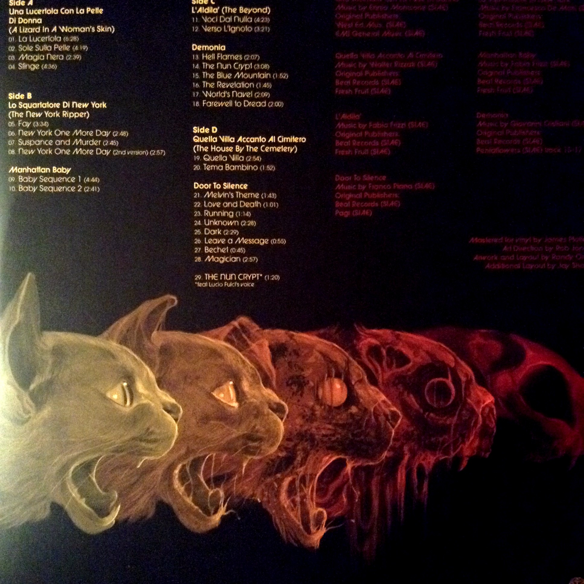 Lucio Fulci’s Horror & Thriller is a recent Mondo release that I just couldn’t pass up. It’s a double album filled with various musical pieces from six of Fulci’s films. I own the Death Waltz Recording Company releases of House By The Cemetery and City of the Living Dead, but only HBTC is included on this collection. The rest of the pieces included I don’t own so I felt good about spending my hard-earned cash. The films included are Una Lucertola Con La Pelle Di Donna(A Lizard In A Woman’s Skin), Lo Squartatore Di New York(The New York Ripper),Manhatten Baby, L’Aldila(The Beyond), Demonia, Quella Villa Accanto Al Cimitero(The House By The Cemetery), and Door To Silence. Of the films listed here, I’ve seen three of them. I really have no desire to rush out and check out Lizard Woman, Demonia, or Door To Silence. Sorry Lucio, but I got bigger fish to fry. But the films I have seen of Mr. Fulci, four were masterpieces in Italian horror and one was a piece of garbage I’d offer to a friend with a cat so they could line their litter box with it. The New York Ripper took those hints of misogyny and absolute stupidity that was hinted at in earlier films and pretty much turned it up full blast. The Shit-O-Meter was turned up to 11 in that piece of junk. But House By The Cemetery, The Beyond, and City of the Living Dead, as well as Zombi 2, are films that defined what I would look for in the horror genre for years to come. And what stayed with me more than anything was the scores that soundtracked these films.