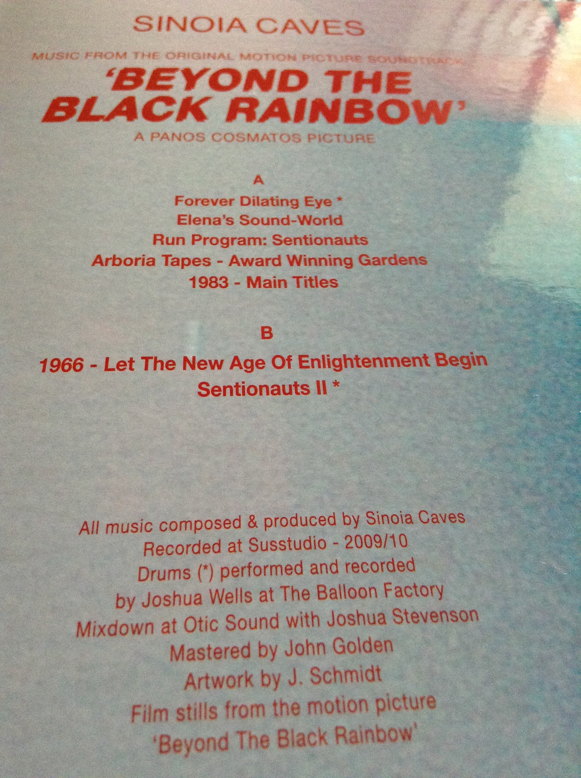 The S/T was written and performed by Sinoia Caves, aka Jeremy Schmidt. He’s the keyboardist in the excellent Black Mountain. On their debut Schmidt was there but not very pronounced. On the album that proceeded it, In The Future, Schmidt made his presence known. Steeped in organ and spacey synths, that album pretty much defined Black Mountain as the quintessential 21st century purveyors of stoned, 70s progressive rock. When Schmidt is on his own as Sinoia Caves he gets lost in layers of analog synths and droning tones. It’s a beautiful thing. His first record as Sinoia Caves, The Enchanter Persuaded, is a thing of stoned, blissful beauty. All melancholy and spacey, it gave us an idea of what Schmidt could do as a guy alone in a room with a stack of synths. With Beyond The Black Rainbow he went all out. It’s filled with ominous voices -choirs of synth chords and overwhelming walls of saturated tones- that have both the feeling of doom and possible escape from said doom. “Forever Dilating Eye” pulses and moves like the careening new age crash it is. “Elena’s Sound World” is subtle and delicate, like the character in the film(movie) it’s named after. “Run Program: Sentionauts” sounds like Ken Hensley getting crazy with Uriah Heep, while “Arboria Tapes – Award Winning Gardens” is subtle and hazy. “1966 – Let The New Age Of Enlightenment Begin” is the tour de force here. It’s nearly 17 minutes of synths wavering in and out, fighting for attention. It’s like a hallucinogenic trip into some dark world. A synth symphony warming up out of key and nightmarish. It’s also during a pivotal scene in the film(movie.)