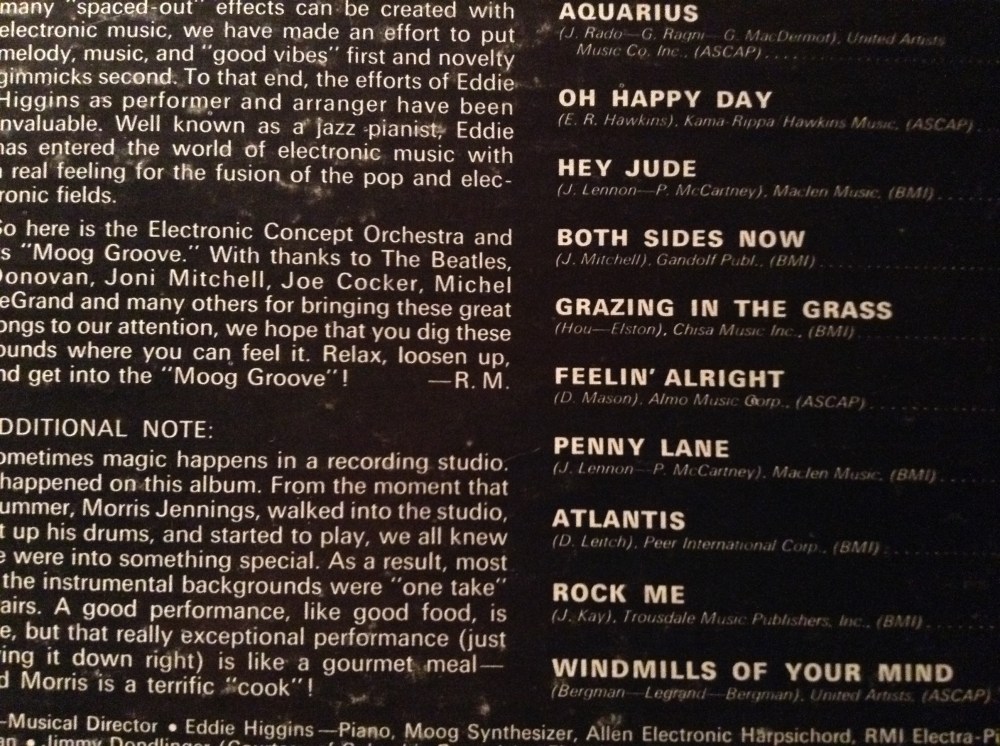 So now that you know how I came to possess Moog Groove, let me tell you about it. It came out in 1969, and it was a novelty LP where hits of the day were performed almost entirely on a moog synthesizer. By this time the moog had gone from this space age instrument creating the sounds of the future to the musical equivalent of a plastic kazoo or a whoopie cushion. They were being used for sound effects on tv shows and sci fi films, while one was even highlighted in a beer commercial.