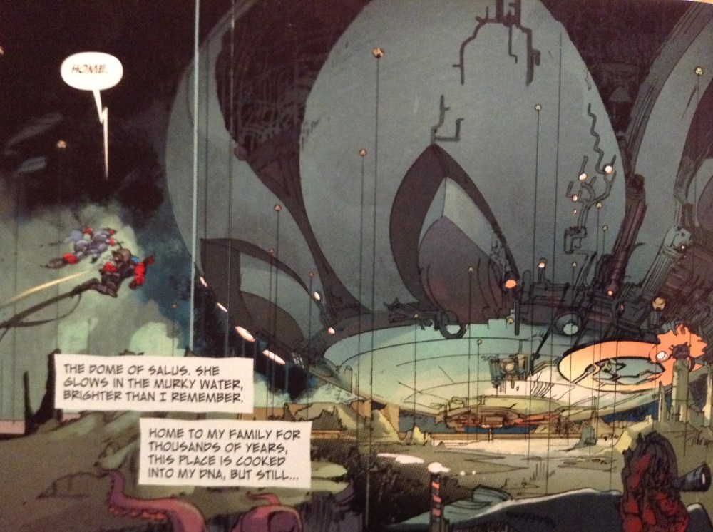 The story to this point spans over several years from the beginning to where I’m currently at, so I’m not going to drop storylines and action. I’m just going to say that this is one of the most riveting and captivating stories I’ve read in a long time. Like the best graphic novels, the story is something you can lay over your own life and can relate to. If you’re in a family dynamic in your own life then you can relate. Remender has written a dense world with characters you can relate to. Characters flawed(and in some cases quite terrible), yet even the worst of the worst seem to find redemption from the actions they’ve taken. Of course, I can’t really relate to the earth crisping from the sun to the point where I have to live in an underwater city, but the human elements are all there.
