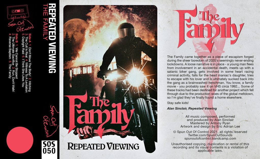 With his newest release, once again partnering with the excellent Spun Out Of Control, Sinclair takes Repeated Viewing into the world of dysfunctional families, via of course a satanic biker gang. Coming out of coping with the lockdowns of 2020, The Family is filled with all the delightfully retro vibes of dusty late 80s video store rental boxes, this one scoring a story involving family tragedies, escaping guilt by filling the void with a far more sinister family(in this case a Satanic biker gang), and finding love in all the wrong places. Repeated Viewing has once again given us a score for a movie that doesn’t exist, but I damn sure wish it did.