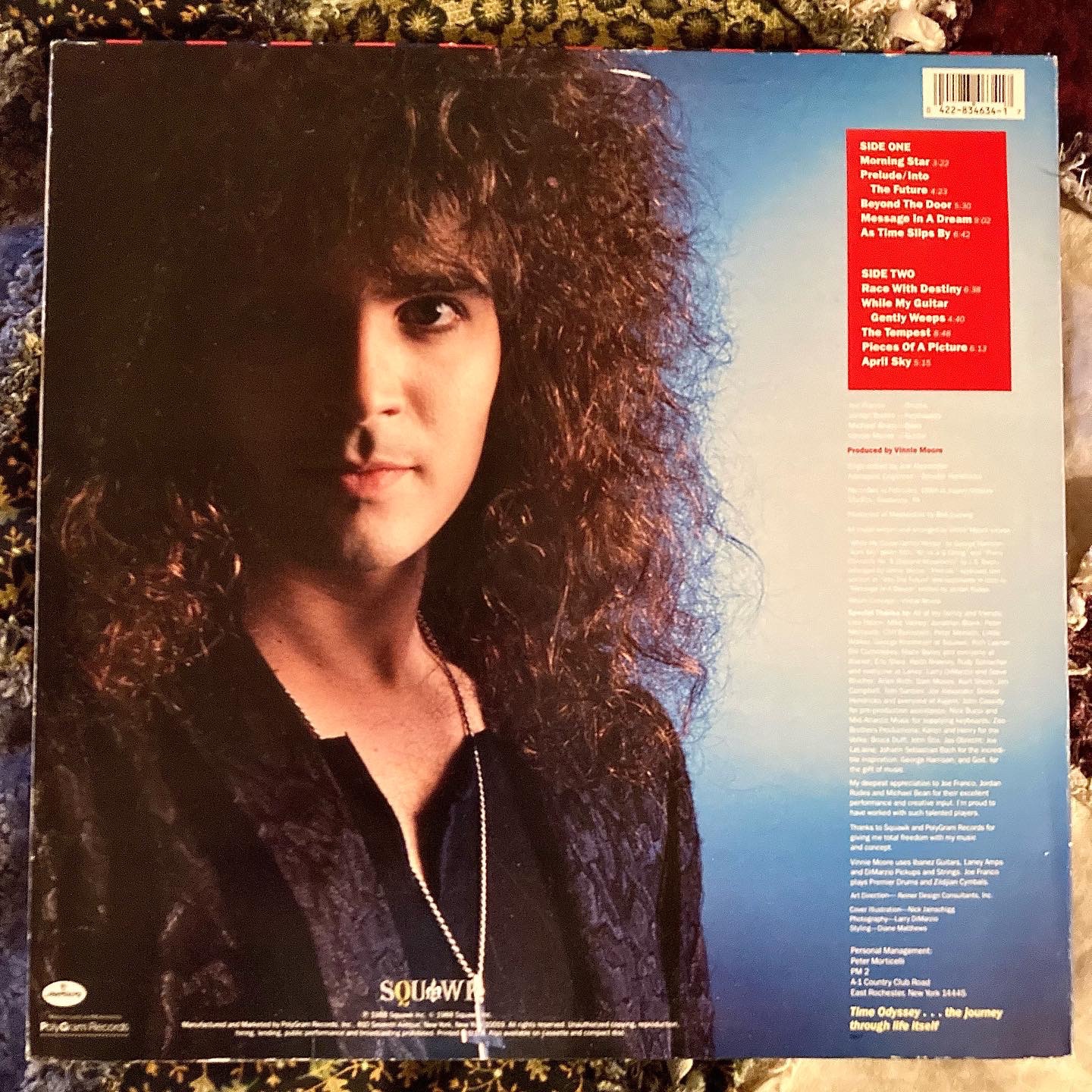 Two years later. 1988. I had just gotten my electric guitar and was heavy into the guitar world. Buying up shredder cassettes and listening to stuff I’d never emulate. Moore’s Mind’s Eye was one I picked up. It was liked but I didn’t obsess over it. Then I saw(not through my mind’s eye but an ad in Guitar World) that Vinnie Moore had a new album called Time Odyssey out on a new label, Polygram.