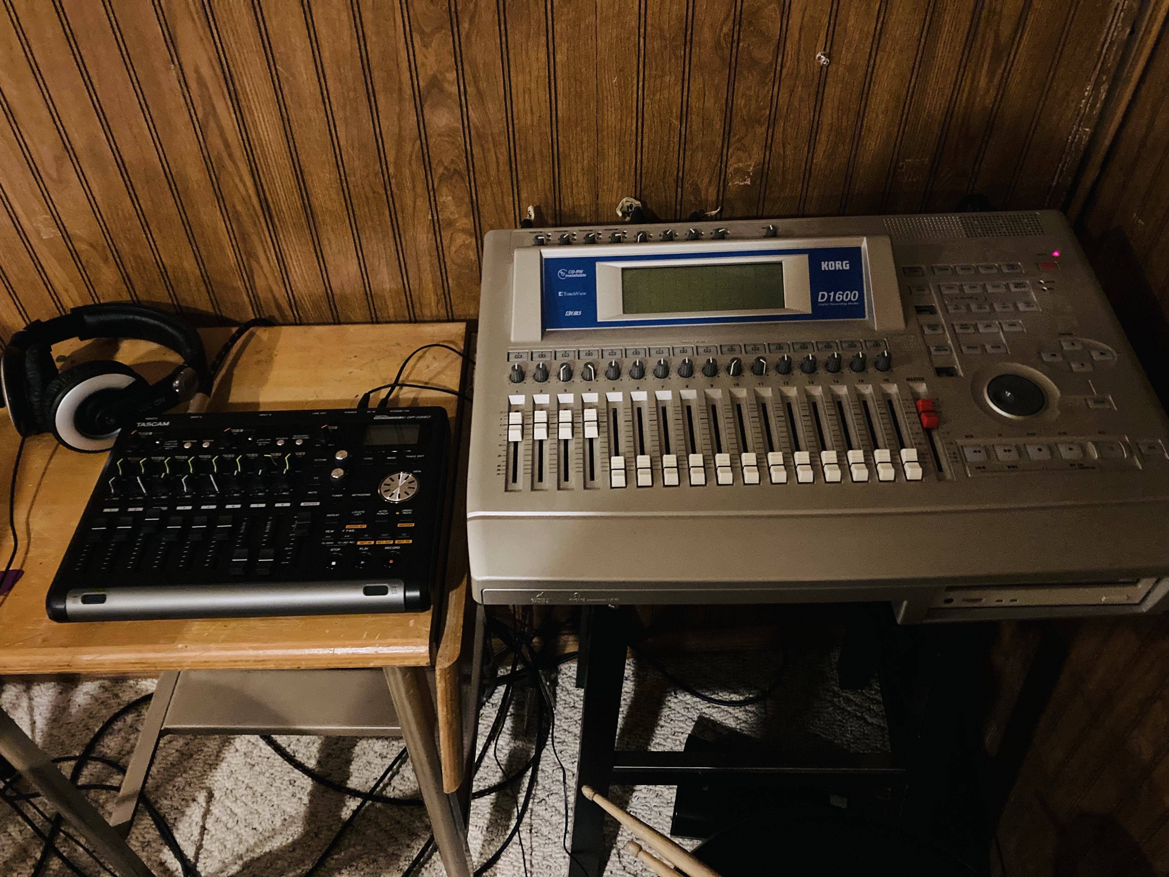 It all sounds kind of ridiculous, I’m sure. Most people would go with a music program on their computer then have limitless tracks to record, but not me. I’m pretty old school in that regard. I grew up learning on standalone multi-track recorders, starting with a Tascam 424 cassette 4-track recorder. Then worked my way up to digital recorders. I just like it that way. I found this great Tascam 8-track digital recorder back in the fall of 2023 and I’ve loved working with it. I wasn’t recording acoustic drums, but with the last few ideas I’ve had I’ve wanted to incorporate them into the music. This makes it relatively easy, using the old recorder as a drum mixer, complete with effects and EQ, so I can tweak the sound to where I like it then record them onto the new recorder. It’s not the most ideal setup, but it works for me.