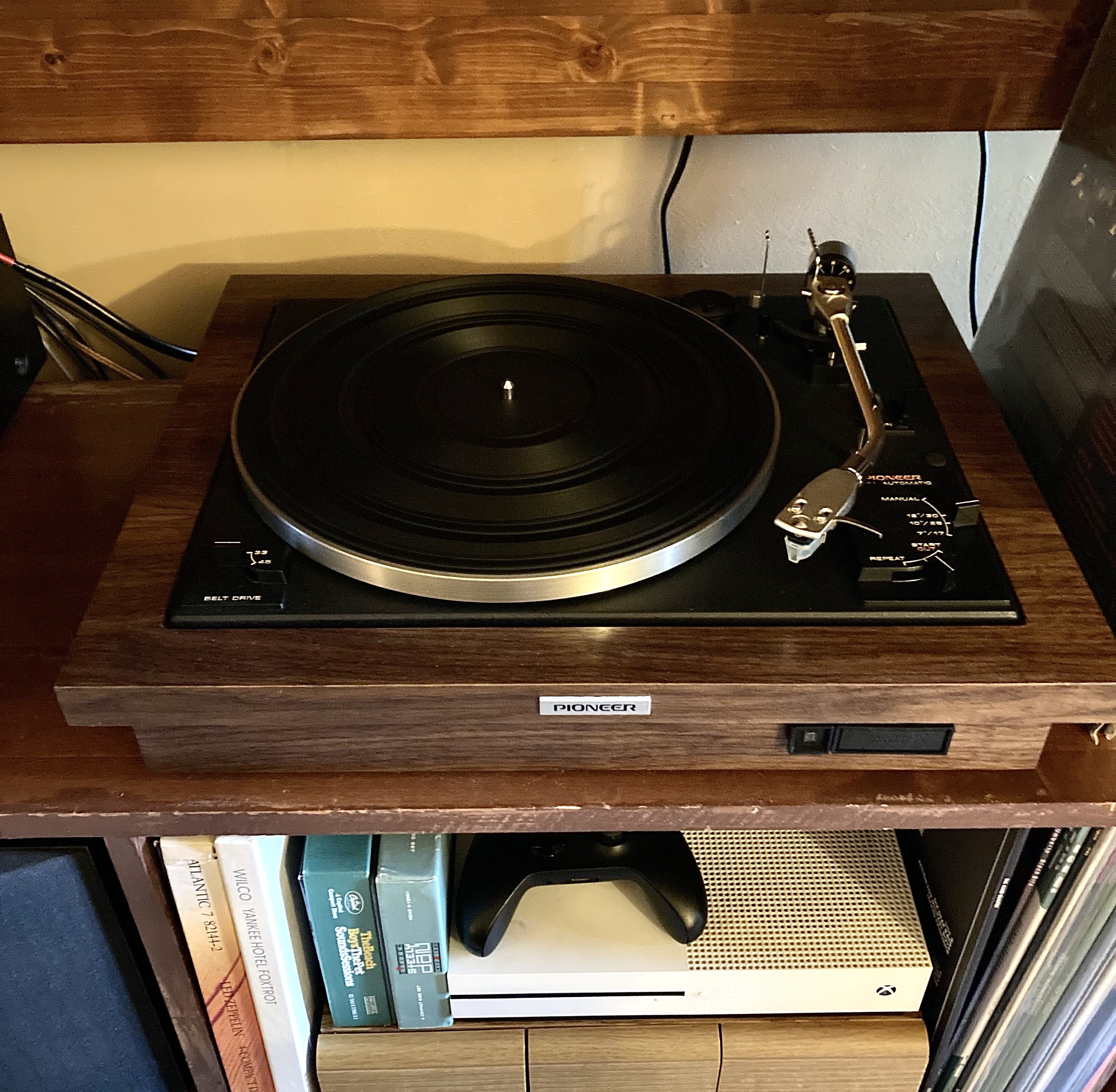 Before we headed to see our grandpuppy, we made a pit stop at Karma Records of Warsaw and picked up my new “old” turntable, a fully restored Pioneer PL-A35. A guy I work with restores vintage stereo equipment and had started taking the restored turntables into Karma and selling them. He’d taken in a Fisher TT back in late spring. I thought it looked immaculate with the wood base, but by the time I asked about it someone had snagged it up. So when another came along I didn’t wait.