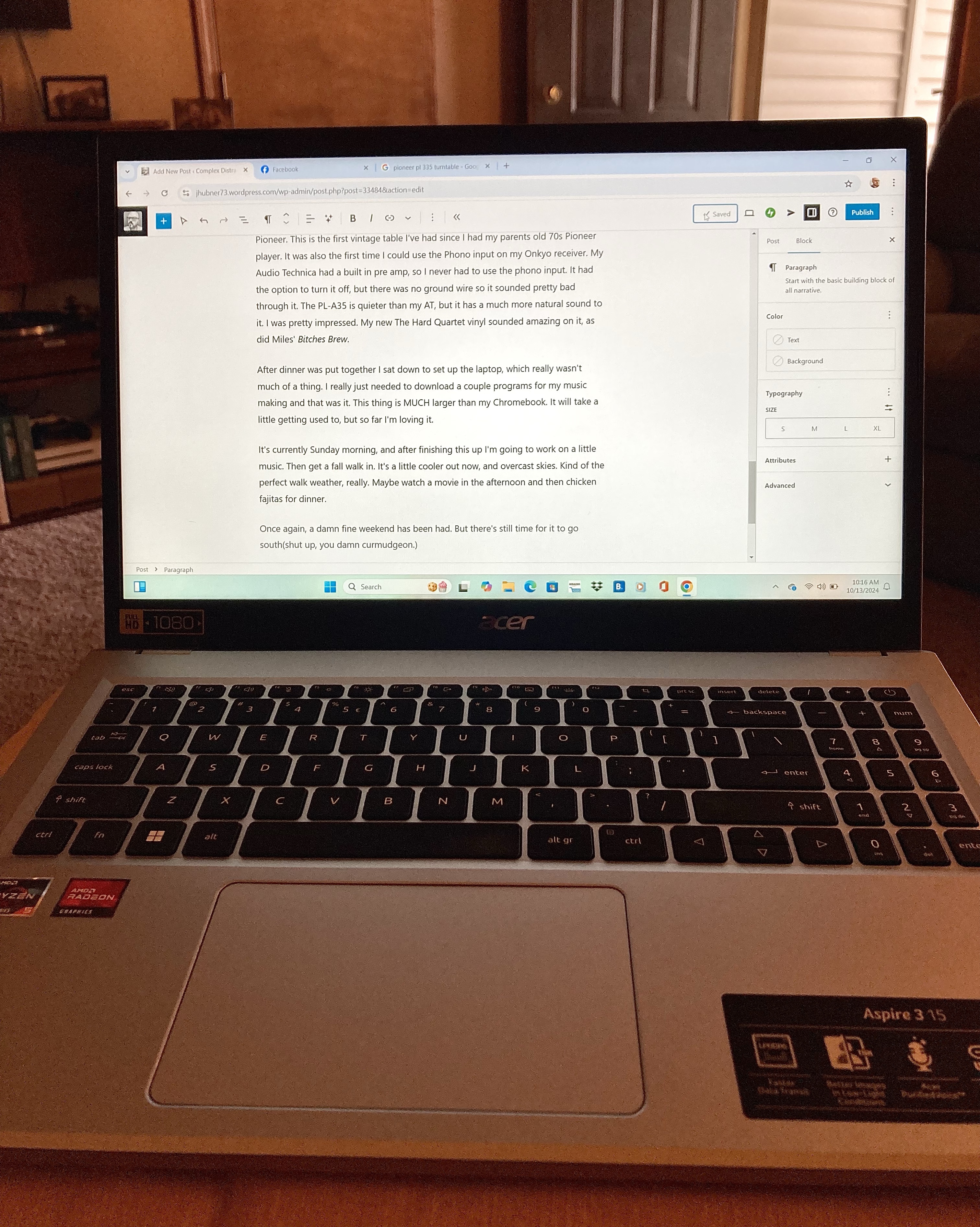 After dinner was put together I sat down to set up the laptop, which really wasn’t much of a thing. I really just needed to download a couple programs for my music making and that was it. This thing is MUCH larger than my Chromebook. It will take a little getting used to, but so far I’m loving it.