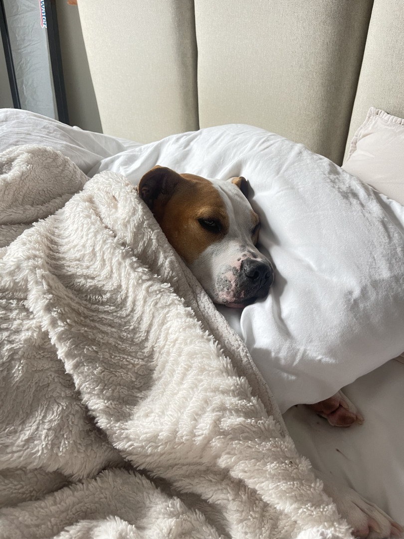 After a much needed trip to New York at the beginning of November of 2023 to hang with her best friend she returned and decided she wanted to give another dog a home that was at the shelter. She went to the Kosciusko Co. Animal Welfare League and found Celeste, a three-year old Staffordshire mix that had been at the shelter for 9 months. She was found abandoned and was brought in, pregnant with a litter of pups. She gave birth at the shelter and all her pups were adopted out. Celeste remained, alone and slowly becoming emaciated. My daughter took her out on a walk at the shelter and Facetimed me at work, crying because Celeste was so quiet and calm. I knew then that her and Celeste were going to be best friends.