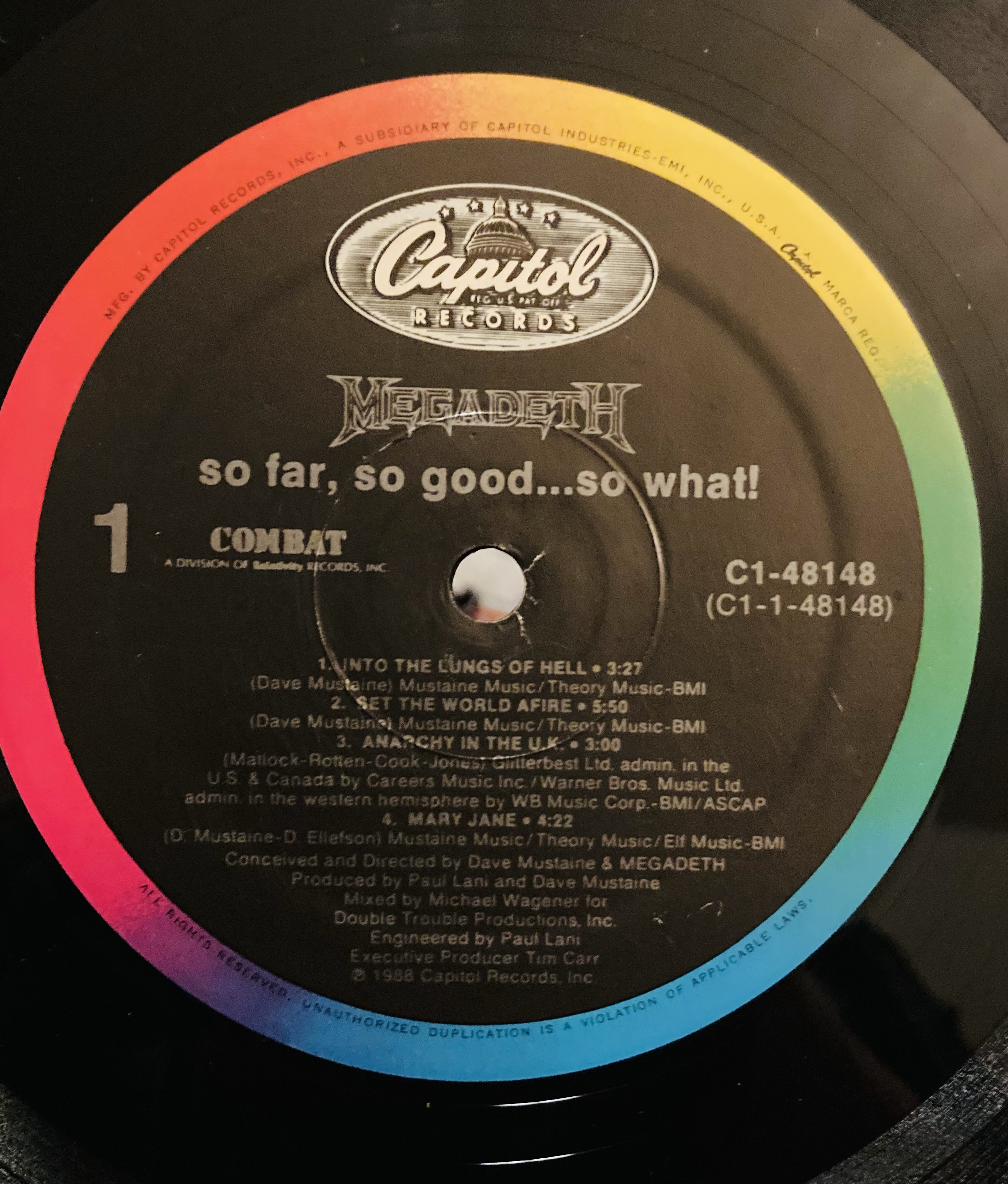 I recently pulled my very beat up but still playable vinyl copy of So Far, So Good…So What! out of the library and man does it still jam. I still absolutely love this record from start to finish. Hearing it takes me back to the winter of 1988; putting it in my player in the basement and trying to learn “In My Darkest Hour” with the tabs lying open in front of me. I can remember road trips with my older brother listening to it, even heading to the very mall he bought Master Of Puppets so I could buy Anthrax State Of Euphoria. We listened to Megadeth on our way, and Anthrax on the way back.