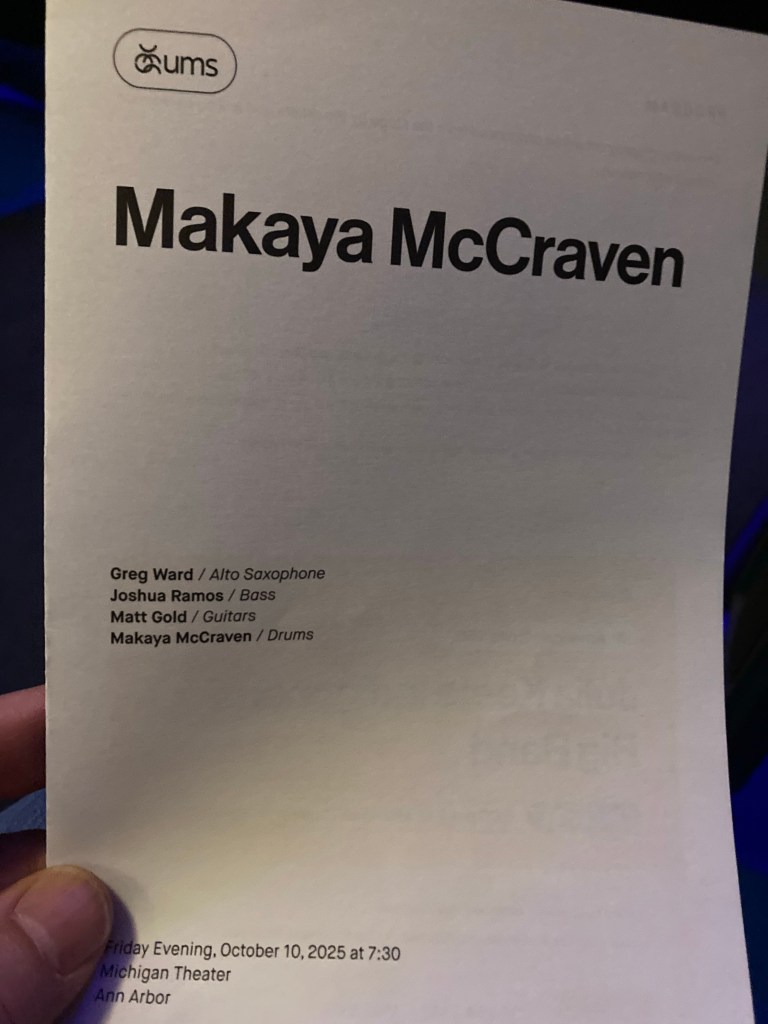 Why was Ann Arbor our destination? We had tickets to see the great jazz drummer(or beat scientist) Makaya McCraven at the Michigan Theater. This is an artist I’ve been all about for a few years now. He, along with guys like Jeff Parker and Joel Ross, have become to my ears the new sound of modern jazz. They are pushing the idea of what jazz can be, adding elements of hip hop, psychedelia, and experimental sound collages to the mix. McCraven approaches jazz music more like the way Miles Davis and Teo Macero approached it in the mid-60s and early 70s. Taking live improvisations, recording them, and then reconfiguring those recordings into a studio work.
